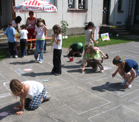 Žiaci 1.stupňa a deti MŠ pripravili na privítanie hudobno–tanečný program. V pekne vyzdobenom prostredí boli pripravené pre deti rôzne súťaživé hry na rozličných stanovištiach: - triafanie do cieľa, skákanie vo vreciach, prenášanie loptičky v lyžici. Športové zdatnosti si mohli vyskúšať na boccii a chodúľoch. Výsledkom výtvarného snaženia na asfalte boli kresbičky s námetom „V našom dome je porozumenie a priateľstvo.“